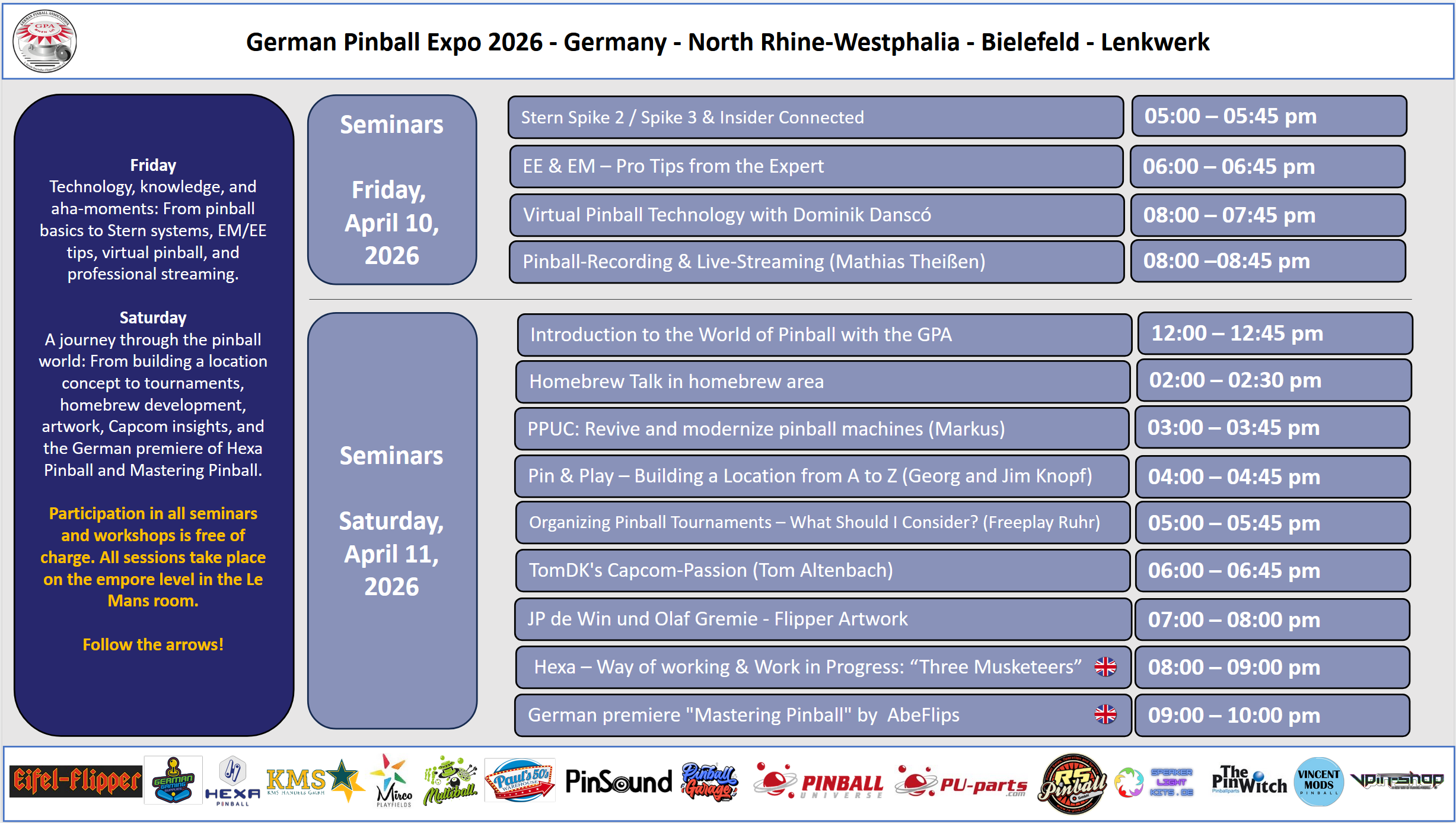 All seminars will be held in German. Exception: Flipper Artwork and Hexa Pinball will be held in English.